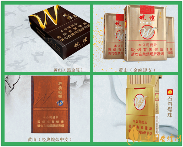 徽商香煙:黃山徽商有兩款,一款是深紅色包裝的“黃山”(徽商新視界),一款是金黃色包裝的“黃山”(徽商新概念)。