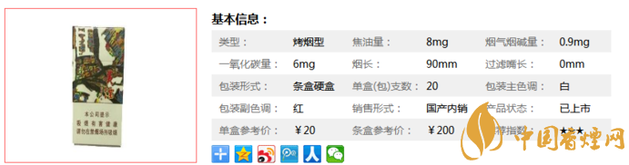 | 類(lèi)型 :烤煙型 | 焦油量 :8mg | 煙氣煙堿量 :0.9mg | 一氧化碳量 :6mg |