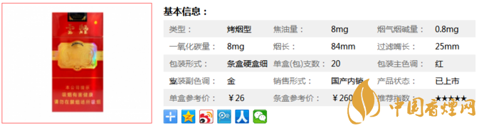 類型 :烤煙型 焦油量 :8mg 煙氣煙堿量 :0.8mg 一氧化碳量 :8mg