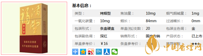類型 :烤煙型 焦油量 :10mg 煙氣煙堿量 :1mg 一氧化碳量 :10mg