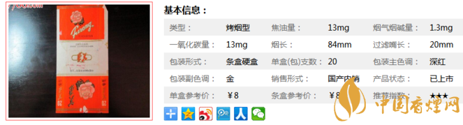 | 類型 :烤煙型 | 焦油量 :13mg | 煙氣煙堿量 :1.3mg | 一氧化碳量 :13mg |