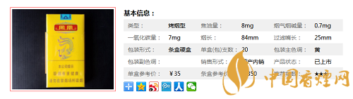 類型 :烤煙型 焦油量 :8mg 煙氣煙堿量 :0.7mg 一氧化碳量 :7mg