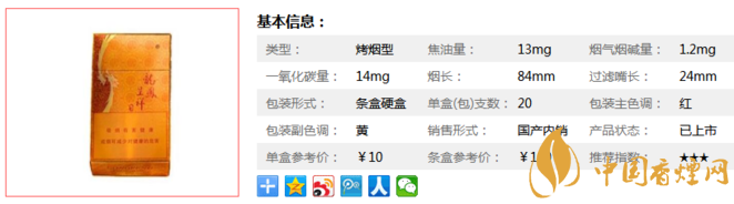 類型 :烤煙型 焦油量 :13mg 煙氣煙堿量 :1.2mg 一氧化碳量 :14mg