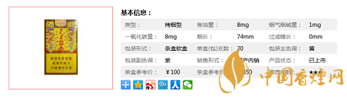 類型 :烤煙型 焦油量 :8mg 煙氣煙堿量 :1mg 一氧化碳量 :8mg
