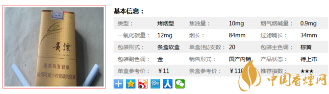 類型 :烤煙型 焦油量 :10mg 煙氣煙堿量 :0.9mg 一氧化碳量 :12mg