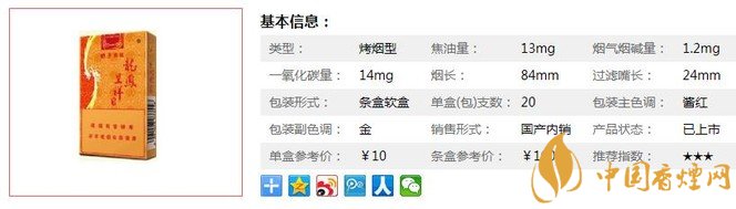 類型 :烤煙型 焦油量 :13mg 煙氣煙堿量 :1.2mg 一氧化碳量 :14mg