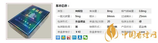 類型 :烤煙型 焦油量 :8mg 煙氣煙堿量 :0.8mg 一氧化碳量 :9mg
