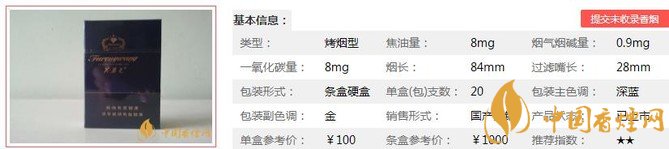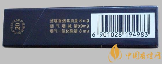 類型 :烤煙型 焦油量 :8mg 煙氣煙堿量 :0.9mg 一氧化碳量 :8mg