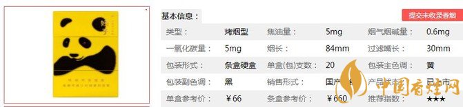 類型 :烤煙型 焦油量 :7mg 煙氣煙堿量 :0.8mg 一氧化碳量 :7mg