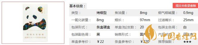 類型 :烤煙型 焦油量 :8mg 煙氣煙堿量 :0.9mg 一氧化碳量 :8mg