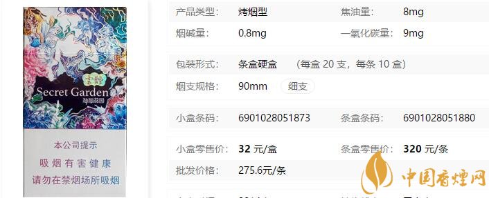 云煙(神秘花園)煙支長:90mm,烤煙型,包裝形式:條盒硬盒(每盒 20 支,每條 10 盒)。超細支的整體形式更凸顯產(chǎn)品的細致、優(yōu)雅、個性獨一,整個版面色調(diào)以紫羅蘭色為基礎(chǔ)色,藍、紅色為其點綴,凸顯設(shè)計的高貴、神秘。下面我們一起來看云煙(神秘花園)的參數(shù)信息:焦油量:8mg 煙堿量:0.8mg 一氧化碳量:9mg