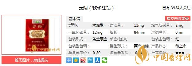 云煙軟珍紅鉆煙支長84mm,過濾嘴長25mm。以高端制絲平臺為基礎,優(yōu)化工藝參數(shù),通過獨有多級加料、高溫增香、橡木桶發(fā)酵等工藝技術,充分發(fā)揮煙葉原料潛質(zhì)和使用價值,強化產(chǎn)品清甜香特征。下面我們一起來看云煙軟珍紅鉆的參數(shù)信息:焦油量:11mg 煙堿量:1.0mg 一氧化碳量:12mg