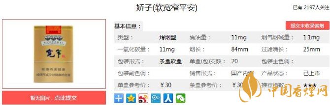 嬌子(寬窄平安)香煙有著寬窄系列香煙傳統(tǒng)的口感和味道,細(xì)膩而香醇,在綜合口感上面保持的比較出色。吐出煙霧的進(jìn)程中,口腔內(nèi)也會時時體會到那種略顯甜的清香味道。下面跟著香煙網(wǎng)小編一起來了解嬌子(寬窄平安)的相關(guān)信息吧。
