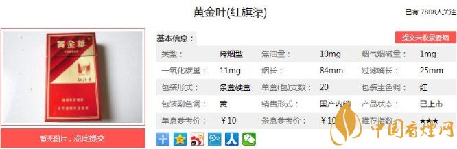 硬紅旗渠內襯紙為銀色,煙支7-6-7排列。煙嘴很漂亮,有一道金箍圈在煙嘴和煙支之間,顯得豪華大氣,煙支上印著黑色紅旗渠楷體漢字以及紅色HONGQIQU漢語拼音。下面便是黃金葉(硬紅旗渠)的基本參數(shù):焦油量:10mg 煙堿量:1mg 一氧化碳量:11mg.