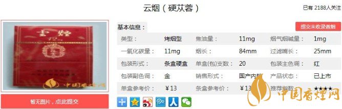 云煙(硬蓯蓉)采用特制嘴棒、高透氣度盤紙及激光打孔水松紙等新型卷煙材料,產(chǎn)品具有較高技術(shù)含量。硬蓯蓉直到掀開翻蓋深嗅,才能聞到那股特殊的香味。下面便是云煙(硬蓯蓉)的基本參數(shù):焦油量:11mg 煙堿量:1.0mg 一氧化碳量:11mg.