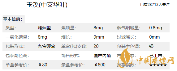 玉溪中支華葉煙支長(zhǎng)88mm,過(guò)濾嘴長(zhǎng):25mm,目前市場(chǎng)稀缺,一葉難求,包裝高端大氣,煙氣柔和降焦明顯,制煙工藝精湛,各方面煙氣指數(shù)都達(dá)到了完美平衡。下面我們一起來(lái)看玉溪中支華葉的參數(shù)信息:焦油量:8mg煙堿量:0.8mg一氧化碳量:8mg