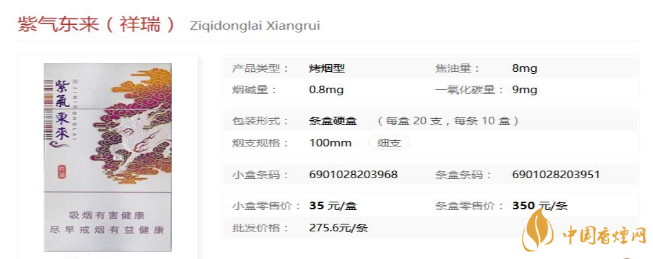 紫氣東來祥瑞煙支長100mm,過濾嘴長35mm,定位在細支煙品類。通過采用低溫保香,多級復(fù)配等特色工藝,使產(chǎn)品煙草本香更加突出,抽吸的均勻性更加穩(wěn)定,使消費者在享受煙草香氣的同時,又能體味自然舒適的感覺。下面我們一起來看紫氣東來祥瑞的參數(shù)信息:焦油量:8mg煙堿量:0.8mg一氧化碳量:9mg。