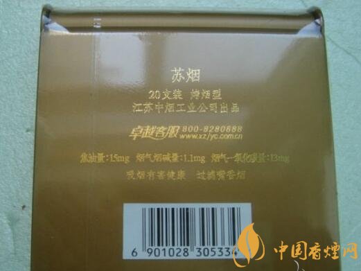 暗金色塑盒包裝,主體為方形,上下兩側(cè)作弧形處理,給人以輕巧圓潤之感。正面左側(cè)一道極似女人身體曲線的“S”形劃過,旁邊有繁寫的“蘇煙”二字,右下方是“江蘇中煙工業(yè)公司出品”,設(shè)計簡約,表意婉約。背面標有商品的基本信息(包括三項理化指標、條形碼等)和警示語。其余四面皆無文字或圖案。