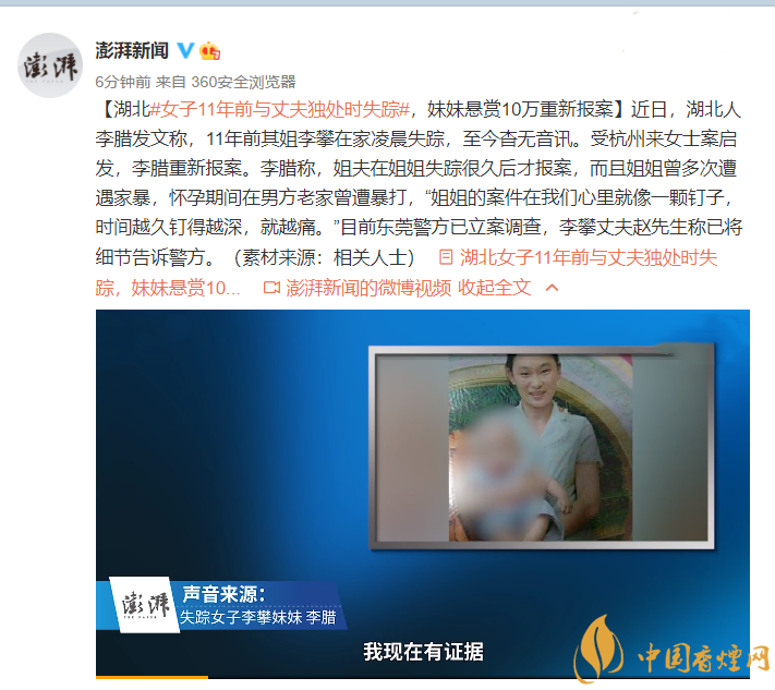 湖北女子11年前與丈夫獨(dú)處時(shí)失蹤,妹妹懸賞10萬(wàn)重新報(bào)案