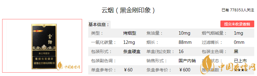 黑金剛印象為烤煙型香煙,焦油量為10mg,煙堿量為1.0mg,一氧化碳量為12mg。小盒零售價(jià)是60元/盒,條盒零售價(jià)為600 元/條。具體參數(shù)如下: