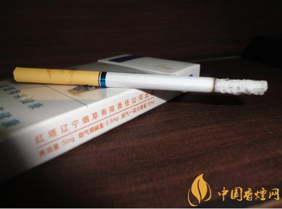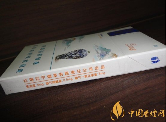 煙盒的右側(cè)注明了理化數(shù)值,紅塔遼寧煙草有限責任公司出品方名稱,焦油量:5mg、煙氣煙堿量:0.5mg、煙氣一氧化碳量:5mg,還印有顯眼的深藍色環(huán)保標識。