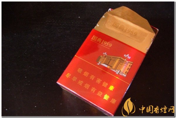 人民大會堂國典1959外包裝色調(diào)呈現(xiàn)為雙色系,一面為鮮紅色,另一面為金黃色。在正面的開盒的部位上有著金色的 “人民大會堂”字樣。煙盒的中間部分略上是“國典1959”,接著是人民大會堂圖案。煙盒的下部分是警示語言,“吸煙有害健康,盡早戒煙有益健康”。 該款香煙的煙盒背面是金黃色調(diào),上部分是也就是煙盒的左上角是“國典1959”,煙盒的正中是天安門禮燈圖案。
