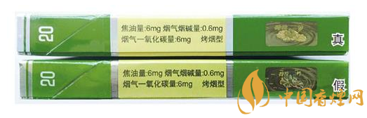 真煙過(guò)濾嘴中的綠色香線較細(xì),顏色也較淡,卷煙紙上線條呈網(wǎng)格狀;假煙過(guò)濾嘴中的綠色香線較粗,顏色也較深,卷煙紙上線條為橫螺紋。