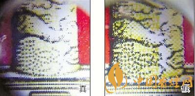 真煙天安門(mén)左側(cè)華表套色均勻,黃白色分布有明顯分界點(diǎn),邊緣光滑、干凈、清晰;假煙套色較差,黃白色不明顯,黃色部分印刷較分散,字體邊緣套印有毛渣點(diǎn),呈現(xiàn)鋸齒狀。
