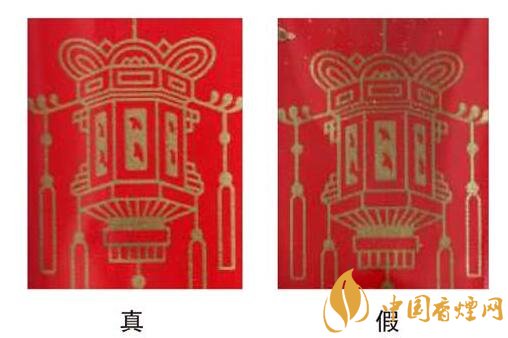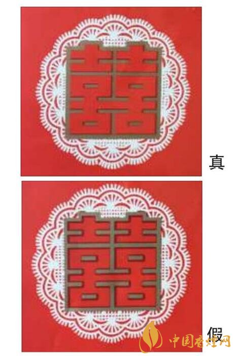 真煙“囍”字體紅色色彩均勻,白色花型圖案的線條較清晰;假煙“囍”字體紅色色彩深淺不一,字體邊緣鋸齒狀明顯,白色花型圖案整體較模糊。