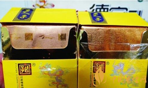 真品小盒正面套印定位燙金“飛龍”圖案鱗片清晰,從頭至尾都能看到定位燙金工藝,紅色貫穿整個(gè)龍身,“鱗片”是雪里透紅,栩栩如生;假煙套印定位燙金仿制較差,鱗片無法達(dá)到真品的印刷工藝水平,印刷工藝與真品商標(biāo)圖案差異明顯。