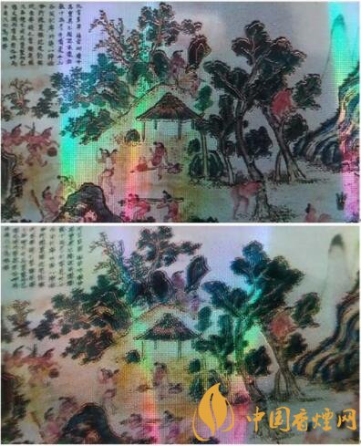 真品卷煙“采香圖”圖案清晰,樹(shù)木燙金線明亮。商標(biāo)紙底紋為點(diǎn)狀,觀察呈現(xiàn)網(wǎng)格狀。該款假冒卷煙“采香圖”圖案模糊,樹(shù)木燙金線暗淡,商標(biāo)紙底紋無(wú)網(wǎng)格狀,呈現(xiàn)菱形圖案。
