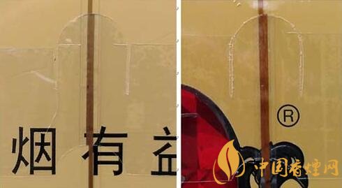 2.注冊(cè)商標(biāo)圖案。真品卷煙采用起凸工藝商標(biāo)印刷,圖案細(xì)節(jié)起凸完美,眼觀(guān)、手摸凹凸感明顯。該款假冒卷煙商標(biāo)印刷起凸工藝較差,部分細(xì)節(jié)未做起凸,手摸圖案平滑。(圖2左真右假)