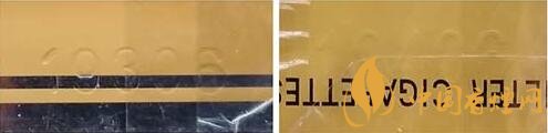 3.鋼印特征。真品卷煙鋼印打印的數(shù)字感覺(jué)較為粗糙,有力度感且排列不整齊。該款假冒卷煙鋼印打印比較輕,無(wú)力度感且排列整齊。(圖5左真右假)