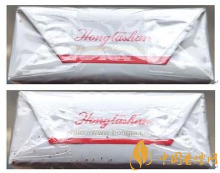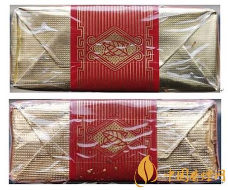 假冒卷煙:1.透明紙燙封收縮雜亂、死板,水汽較重。2.商標(biāo)紙拐角折疊緊實(shí),無空隙。(上真下假)