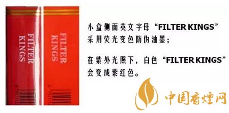 光變防偽涂層——小包側(cè)面“FILTER KINGS”字樣,經(jīng)陽光直射或紫外光照射后由白色變成紫紅色,停止照射后,紫紅色會(huì)逐漸消退。