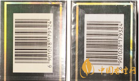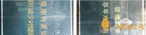 煙用包裝膜材質(zhì)及條形碼對(duì)比:真品卷煙條包裝膜材質(zhì)光滑,均勻無皺褶,條形碼區(qū)域呈淡黃色,套色均勻清楚。假煙條包裝膜材質(zhì)粗糙,有不均勻皺褶,條形碼區(qū)域?yàn)榘咨咨吘壏糯蠛竽:磺濉?/p>