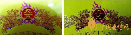 小盒商標紙燙金套印工藝差異比對:真品卷煙小盒商標紙雕刻燙金套印工藝,龍鱗顏色均勻一致,龍珠里“九五”兩字燙金字體飽滿;假煙印刷工藝仿制粗糙,龍鱗顏色失真,龍珠里“九五”套印不準,字體邊緣有明顯脫漆掉色現(xiàn)象,與真品呈現(xiàn)效果差異明顯。